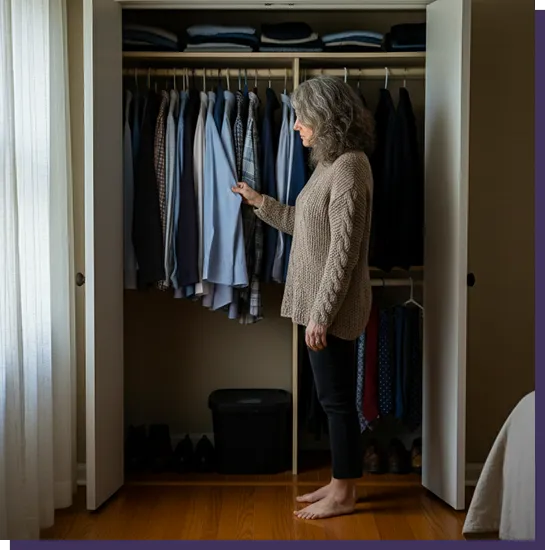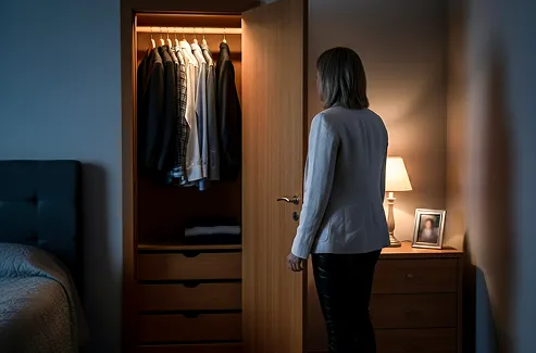You freeze at his closet door—his scent still lingers, and your chest tightens.